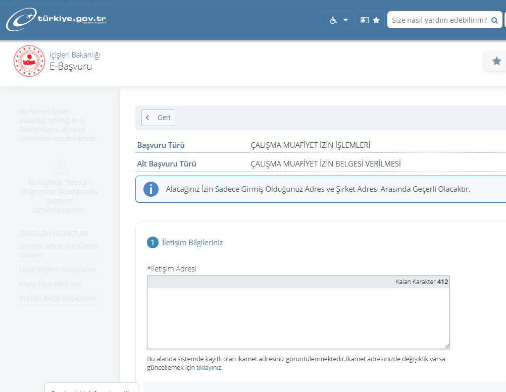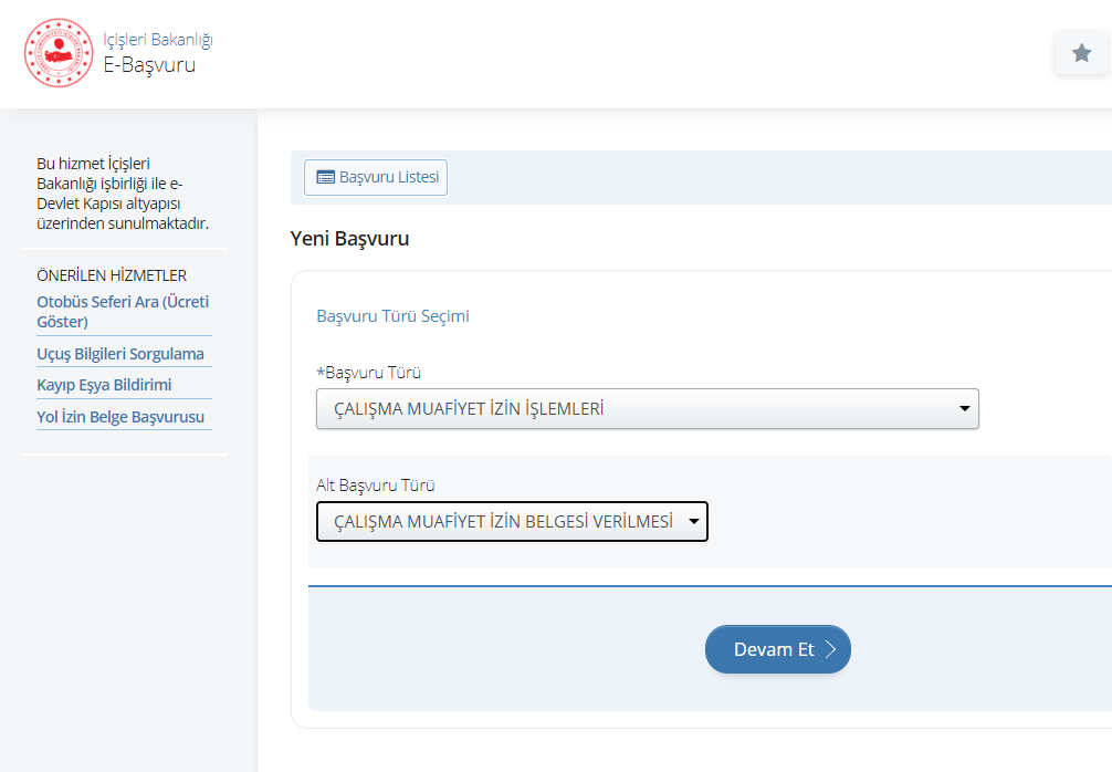 Türkiye Cumhuriyeti İçişleri Bakanlığı EDevlet Hizmetleri E-Başvuru sayfası üzerinden Çalışma Muafiyet İzin Belgesi başvuru sayfası erişim linki: https://www.turkiye.gov.tr/icisleri-e-basvuru?yeni=Basvuru