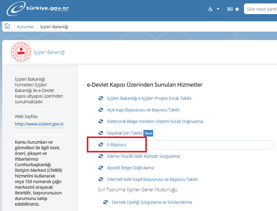 Edevlet üzerinden yapıldığı için edevlete giriş yapılır ve İçişleri Bakanlığı Elektronik Hizmetler Sayfasına geçiş yapılır. https://www.turkiye.gov.tr/icisleri-bakanligi