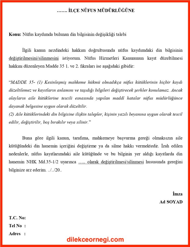 Buna göre ilgili kanun, tarafıma, mahkemeye başvurma gereği olmaksızın aile kütüğündeki din hanemin içeriğini değiştirme ya da silme hakkı vermektedir. İzah edilen nedenlerle, nüfus kayıtlarımdaki aile kütüğünde ve bu bilginin yer aldığı kayıtlarda din hanemin NHK md.35-1/2 uyarınca ...... olarak değiştirilmesi/silinmesi hususunda gereğini bilginize arz ederim. ../../20..