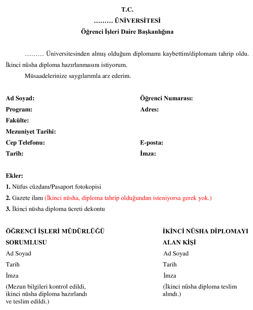 - Ekler (nüfus cüzdanı veya pasaport fotokopisi, gazete ilanı, ikinci nüsha diploma ücreti dekontu)