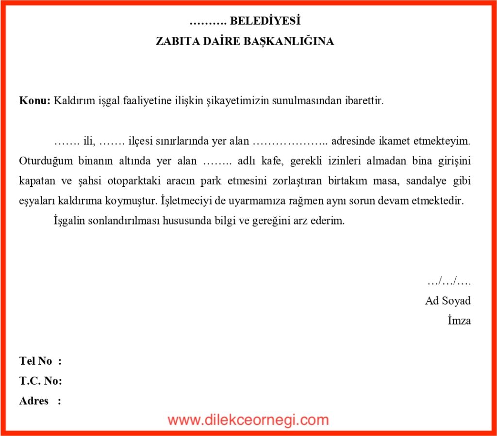 Kaldırım İşgali Şikayeti Dilekçe Örneği