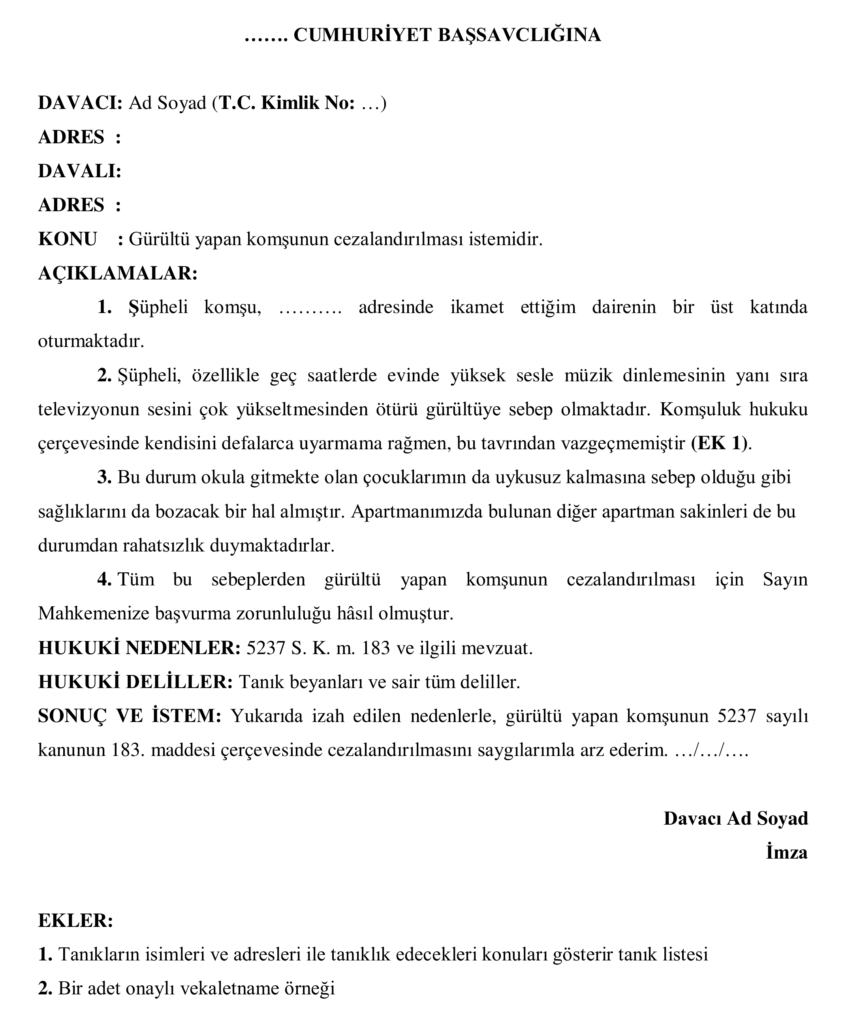 Komşunun gürültü yapması ve kendisine yapılan ikazlara rağmen gürültü devam ediyorsa kişinin, komşuyu şikayet etme hakkı doğmaktadır. Tabii böyle durumlarda olayın ayrıntılı olarak anlatıldığı ve mümkünse tanık beyanlarının da yer aldığı bir dilekçe yazılmalıdır. Aşağıdadan komşu şikayet dilekçesi örneğine hem word hem pdf formatında ulaşabilirsiniz.