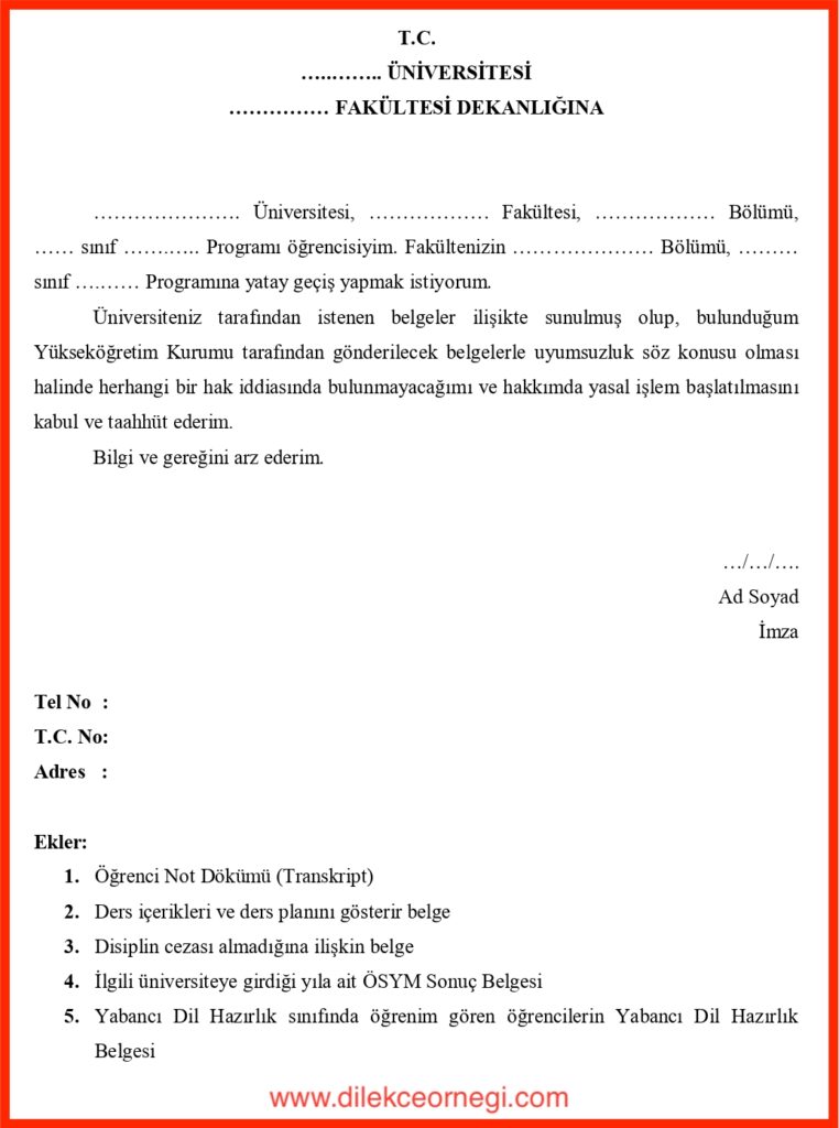 Not 1: Bazı üniversiteler, yatay geçiş için öğrenci işleri biriminden veya internet sitelerinden temin edilmek üzere kendi özel formlarının doldurulmasını talep etmektedirler. Bu durumda bir dilekçe yazmaya gerek kalmayacaktır. Ayrıntılı bilgi için başvurduğunuz üniversite fakültesinin öğrenci işleri birimiyle irtibat kurabilirsiniz.